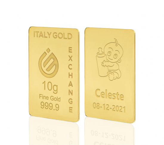 Beschreibung: Goldbarren als Geburtsgeschenk 10 g, 24 Karat (999,9 ‰ Goldgehalt), zertifiziert von "IGE GOLD S.p.A." mit garantiertem Gehalt und Gewicht auf der Vorderseite des Barrens. Jedes Stück wird mit CNC-Fräsen und Lasern bearbeitet, um jede Gravur perfekt und langlebig zu machen. Der Barren wird von Goldschmieden von Hand veredelt und poliert, was dem Produkt Einzigartigkeit verleiht. Im Falle einer Personalisierung wird diese auf der Rückseite des Barrens angebracht. Sie erhalten den Barren in einer Verpackung mit Qualitätszertifikat und Platz für eine von Hand geschriebene Widmung. Optional kann eine separate Präsentationsblister erworben werden, um den Barren auszustellen. Die Zertifizierung des RJC (Responsible Jewellery Council) garantiert die Verwendung von ethisch gewonnenem Goldmetall aus der Lieferkette.