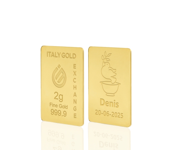Lingote de oro certificado “Italy Gold Exchange” con título garantizado grabado con láser en el frente del lingote.