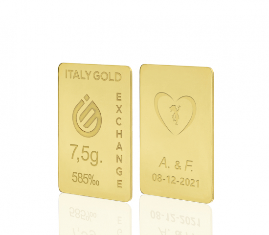 Descriere: Lingou de Aur cadou pentru Căsătorie 7,5 g. 14 k (titlu 585) certificat „IGE GOLD S.p.A.” cu titlu și greutate garantate gravate pe partea anterioară a lingoului. Fiecare piesă este lucrată cu freze cu control numeric și laser pentru o gravură perfectă și de lungă durată. Lingoul este finisat și lustruit manual de artizani aurari. Această caracteristică conferă unicitate produsului. În cazul personalizării, aceasta este afișată pe partea posterioară a lingoului. Veți primi lingoul într-un pachet cu certificat de calitate și spațiu pentru o dedicație scrisă de mână. Un blister de afișare pe care să expuneți lingoul poate fi achiziționat separat. Certificarea RJC (Responsible Jewellery Council) garantează utilizarea metalului provenit din lanțul etic de aprovizionare cu Aur.