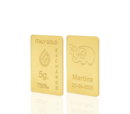 Descriere: Lingou de Aur cadou pentru Naștere 5 g. 18 k (titlu 750) certificat „IGE GOLD S.p.A.” cu titlu și greutate garantate gravate pe partea anterioară a lingoului. Fiecare piesă este lucrată cu freze cu control numeric și laser pentru o gravură perfectă și de lungă durată. Lingoul este finisat și lustruit manual de artizani aurari. Această caracteristică conferă unicitate produsului. În cazul personalizării, aceasta este afișată pe partea posterioară a lingoului. Veți primi lingoul într-un pachet cu certificat de calitate și spațiu pentru o dedicație scrisă de mână. Un blister de afișare pe care să expuneți lingoul poate fi achiziționat separat. Certificarea RJC (Responsible Jewellery Council) garantează utilizarea metalului provenit din lanțul etic de aprovizionare cu Aur.